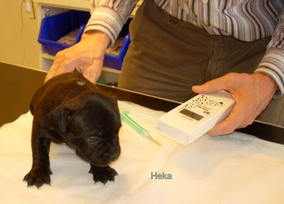 Pennut makasivat korissa vastaanoton lattialla lamautuneina kuin pelokkaat linnunpojat. Niiden oli aika saada niskaan tunnistussiru, jotta viivakoodi voitaisiin kiinnittää Kennelliittoon lähetettävään rekisteröintilomakkeeseen. Uusien ohjeiden mukaan sirutus pitää tehdä ennen rekisteröintiä, ja tunnistusmerkintä tulee siten heti näkyviin rekisterikirjaan. Kauhistutti minuakin pienten pentujen kiusaaminen jättiläismäisellä tunnistusneulalla, mutta Elias sujautti sen niin vikkelästi kaulanahan alle, etteivät pennut ehtineet kuin vingahtaa. Kynsien leikkaaminen saa aikaan paljon suuremman porun. Nyt jokaisella on nimen lisäksi tunnistunumero, jonka sirunlukija tarvittaessa löytää niskan vasemmalta puolelta.